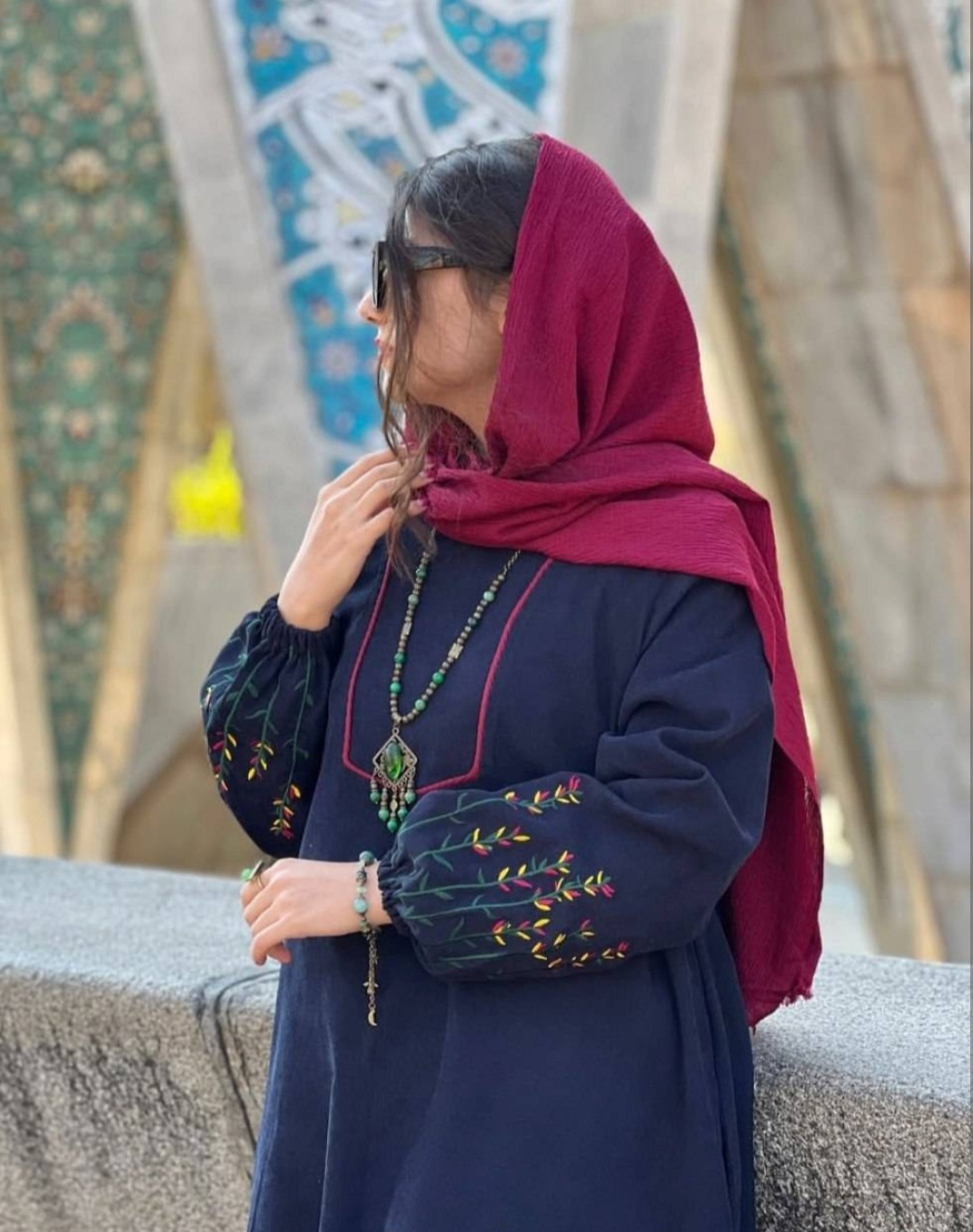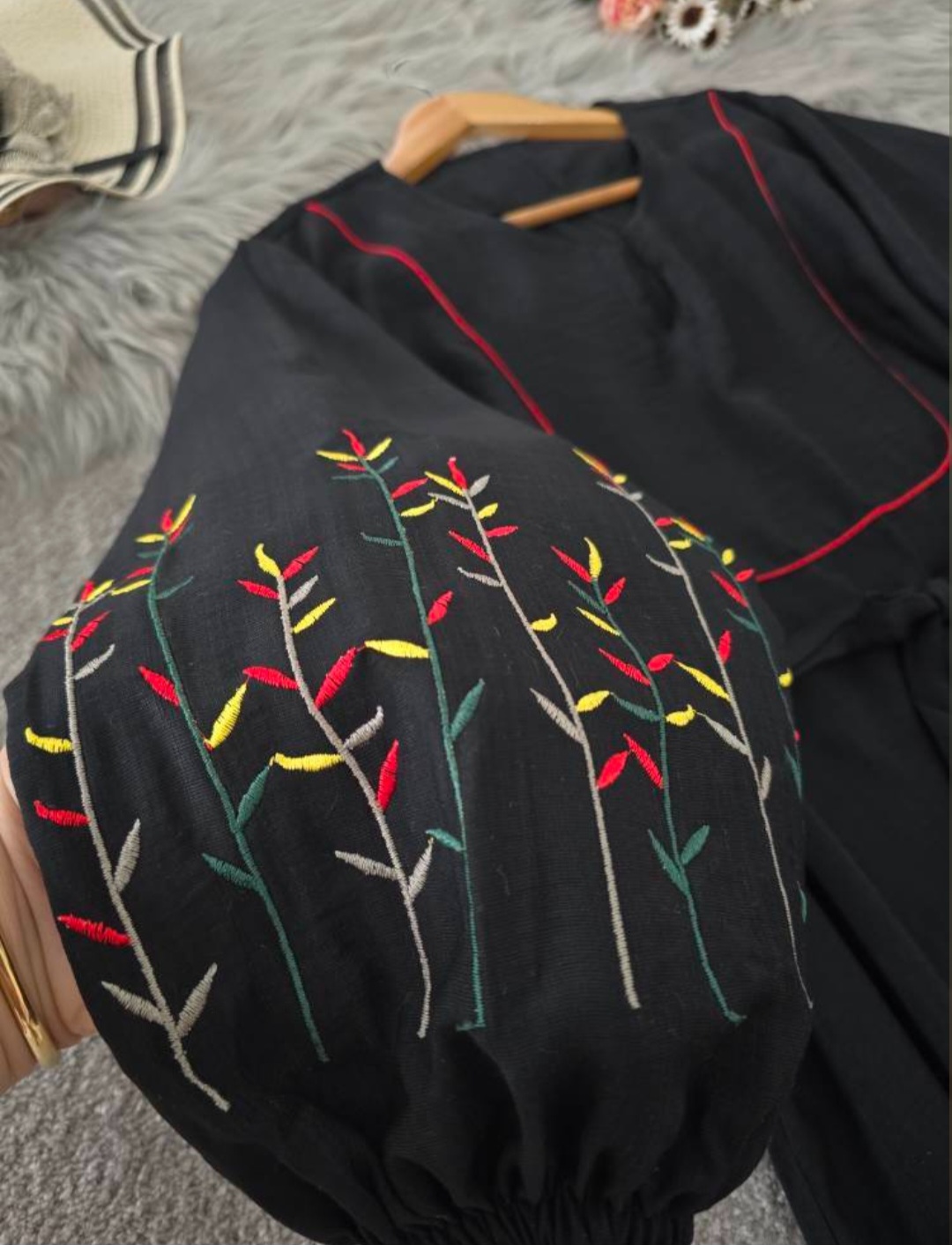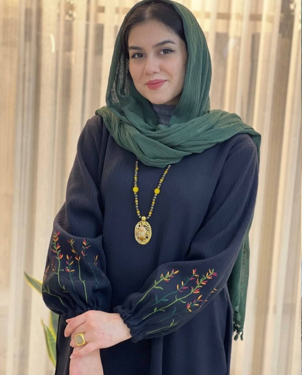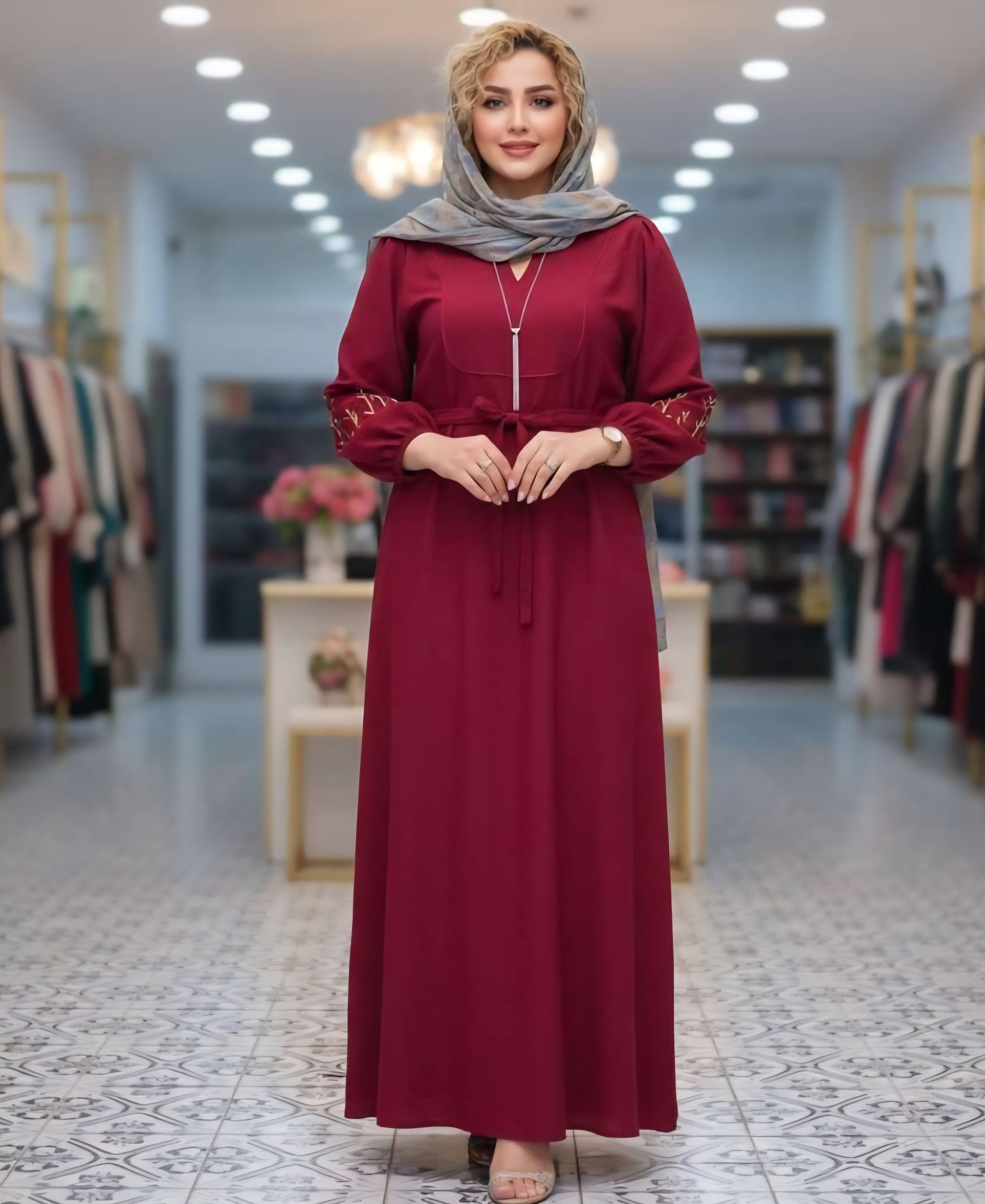 قد 127 تا 132 دور سینه 116فری سایز (40_50) قد آستین از یقه 63 دوربازو 42 دور باسن 130 دور مچ کش دمپا پایین کار 150 گلدوزی شده